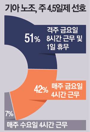 기아 노조원 대다수는 임금 변동 없는 주 4.5일 근무제 도입을 요구할 것으로 보인다.
