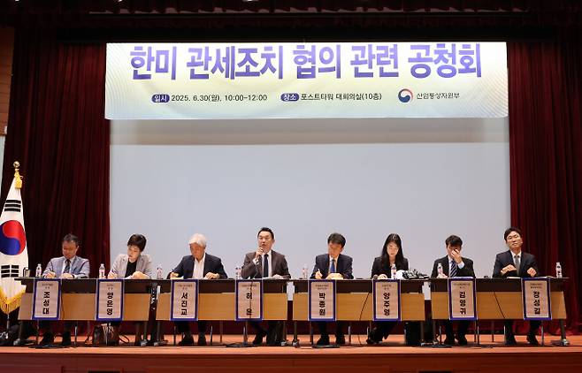 [30일 서울 중구 포스트타워에서 열린 한미 관세조치 협의 관련 공청회에서 패널들이 종합토론을 하고 있다. (사진=연합뉴스)]