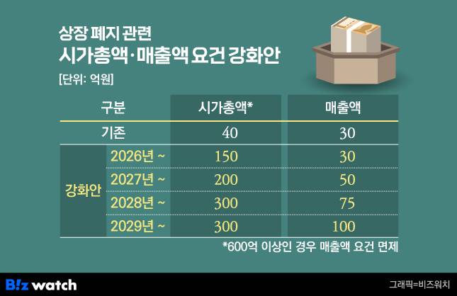 현재 코스닥 시장의 상장폐지 요건 중 시가총액은 40억원, 매출액은 30억원 미만이다. 금융위는 먼저 시가총액 기준을 단계적으로 △2026년 150억원 △2027년 200억원 △2028년 300억원으로 끌어올린다. 매출액 기준도 △2027년 50억원 △2028년 75억원 △2029년 100억원으로 기준을 높인다. 매출액은 시가총액 대비 조정에 시간이 필요한 만큼 1년씩 지연해 실행하는 것이다.