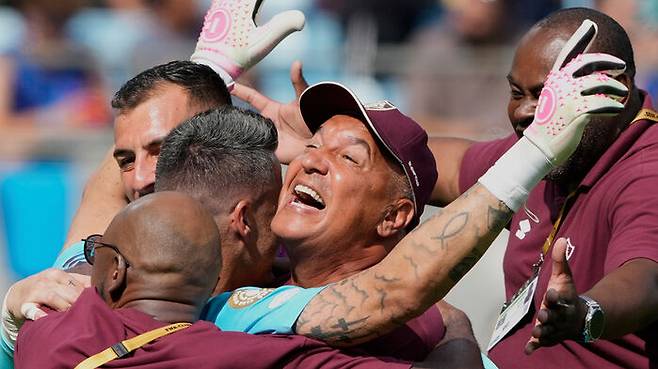▲ 클럽 월드컵 16강전 인터 밀란과 플루미넨시의 경기가 끝난 후 플루미넨시의 파비오가 코치들과 함께 축하하고 있다.