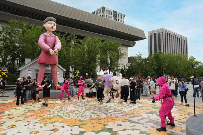 한편, <오징어 게임> 속 공간을 서울 광화문 광장에 그대로 재현해 놓은 팝업도 화제를 모으고 있다. 해당 팝업에서는 시즌3 속 등장하는 ‘줄넘기 게임’을 직접 체험해 볼 수 있을 뿐 아니라 <오징어 게임>의 대표적인 아이콘인 '영희', '철수', 시즌2 속 ‘짝짓기 게임’ 테마 등으로 꾸며진 포토존에서 특별한 추억을 남길 수 있다. 시즌3의 새로운 게임으로 등장해 강렬한 인상을 남긴 ‘줄넘기 게임’ 체험 존은 ‘영희’와 ‘철수’가 지켜보는 가운데 시민들이 직접 줄을 넘으며 마치 참가자가 된 것처럼 게임을 즐길 수 있어 뜨거운 반응을 얻고 있다. 여기에 주말에는 광화문 광장에 등장한 ‘딱지남’과 함께 딱지치기 게임 또한 체험할 수 있다. 뿐만 아니라 ‘줄넘기 게임’을 통해 획득한 스탬프의 개수에 따라 다양한 랜덤 리워드를 받을 수 있는 랜덤 부스와, <오징어 게임> 콜라보 제품들을 만나볼 수 있는 공간까지 마련되어 있어 <오징어 게임> 팝업을 찾는 시민과 관광객의 발걸음은 끊이지 않고 있다. 장대한 피날레로 마무리된 <오징어 게임>의 여운을 이어갈 광화문 팝업은 6월 29일(일)부터 7월 6일(일)까지 진행되며, 사전 예약 없이 현장 웨이팅 시스템을 통해 누구나 참여 가능하다.