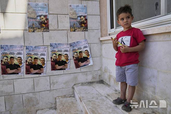 [라말라=AP/뉴시스] 지난달 30일(현지 시간) 유럽 대표단이 요르단강 서안지구 라말라 동쪽 카프르말리크 마을을 방문한 가운데, 한 소년이 앞선 25일 이스라엘 정착민들의 공격으로 숨진 팔레스타인 희생자 3명의 이름과 사진이 담긴 포스터 옆에 서 있다. 2025.07.01.