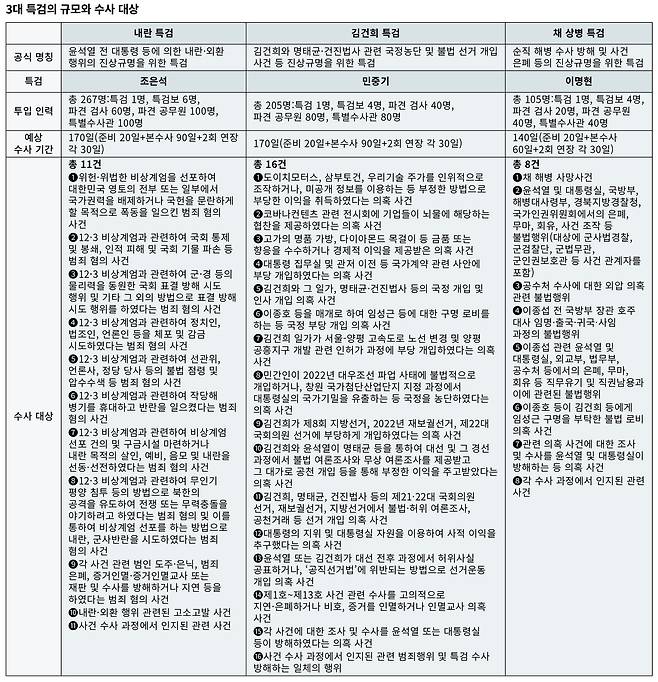 특검은 총 35개 혐의·의혹을 수사한다. 내란 특검은 12·3 비상계엄 사태와 관련한 의혹 총 11건이 수사 대상이다. 김건희 특검은 도이치모터스·삼부토건·우리기술 등 주가조작 의혹, 명품백 수수, 명태균·건진법사 의혹 등 16건을 다룬다. 채 상병 특검은 채 상병 사망 원인부터 윤석열 등의 수사 외압 의혹, 임성근 전 해병대 1사단장 구명 로비 의혹 등 8건을 맡는다. 수사 기간은 채 상병 특검이 최대 140일, 내란·김건희 특검은 최장 170일이다. 특검 규모와 수사 기간 모두 역대 최대, 최장이다. 3개 특검이 동시에 가동되는 것도 헌정 사상 처음이다.