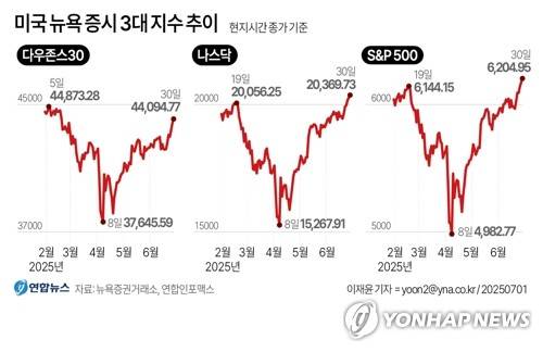 (서울=연합뉴스) 이재윤 기자 = 도널드 트럼프 미국 행정부의 관세정책 유예기간 종료를 앞두고 무역 협상 타결에 대한 낙관론이 부상하면서 30일(현지시간) 뉴욕증시 주요지수가 최고치를 다시 경신했다.