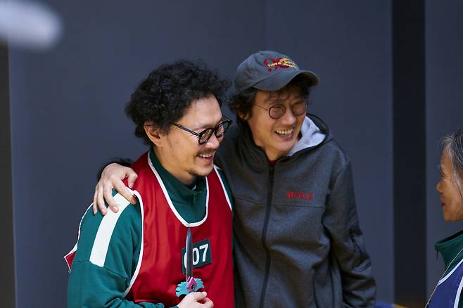 마지막 게임인 '고공 오징어 게임' 세트장에서 만감이 교차하는 표정으로 포옹을 하고 있는 이정재와 황동혁 감독의 스틸은 '오징어 게임'