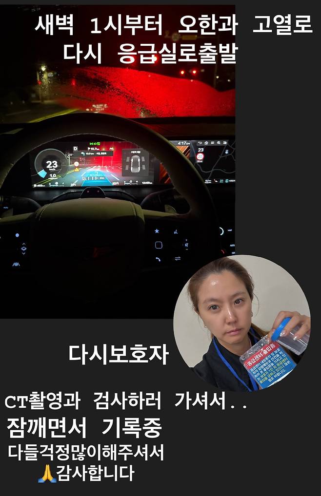 이어 이윤미는 "새벽 1시부터 오한과 고열로 다시 응급실로 출발. 다시 보호자. CT 촬영과 검사하러 가셔서.. 잠 깨면서 기록 중. 다들 걱정 많이 해주셔서 감사합니다"라며 응급센터 출입증을 들고 찍은 사진을 올렸다.