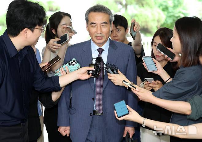 [서울=뉴시스] 이영환 기자 = 윤석열 전 대통령의 부인 김건희 여사 의혹을 수사하는 민중기 특별검사가 1일 오전 서울 서초구 사무실로 출근하며 취재진의 질문에 답하고 있다. 2025.07.01. 20hwan@newsis.com