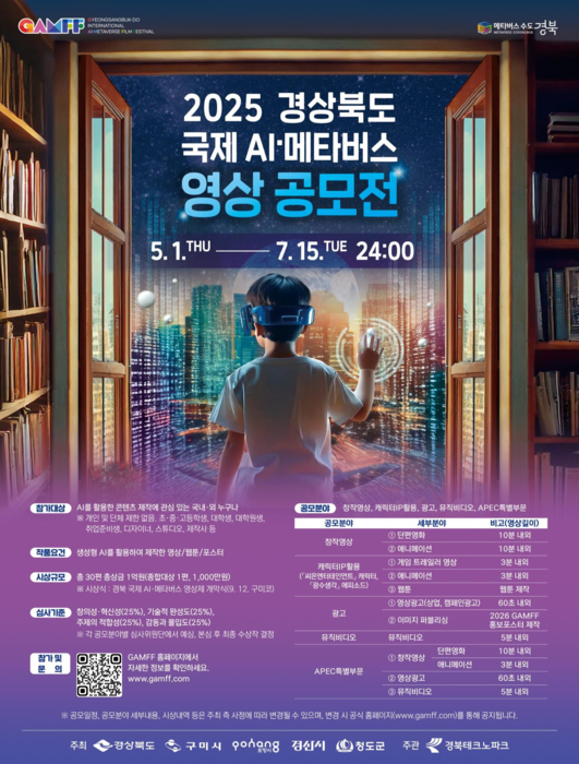 경북도는 '2025 경북 국제 AI·메타버스 영상 공모전'의 작품 접수 마감일을 당초 지난달 30일에서 오는 15일까지로 15일간 연장한다고 밝혔다.