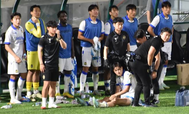 | ▲ 2025년 6월 29일 김포 FC와의 어웨이 게임 종료 직전 동점골을 넣은 문지환이 들것에 실려 나와 벤치 앞에서 남은 추가시간 게임을 지켜보고 있다. |