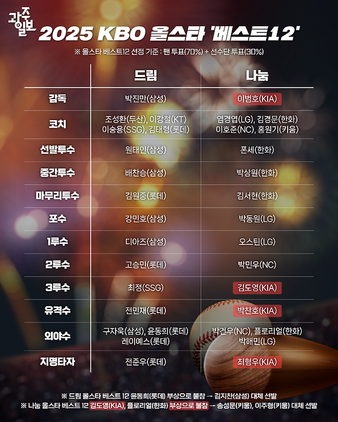 나눔 올스타 3루수 부문 베스트 멤버인 김도영은 부상으로 불참한다.