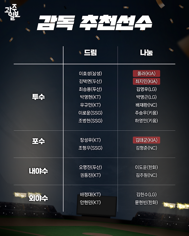 팬투표·선수단 투표를 통해 나눔 올스타 ‘베스트 12’가 된 박찬호(유격수), 최형우(지명타자)와 함께 감독 추천 선수로 선정된 올러·최지민(이상 투수), 김태군(포수) 등 5명이다.