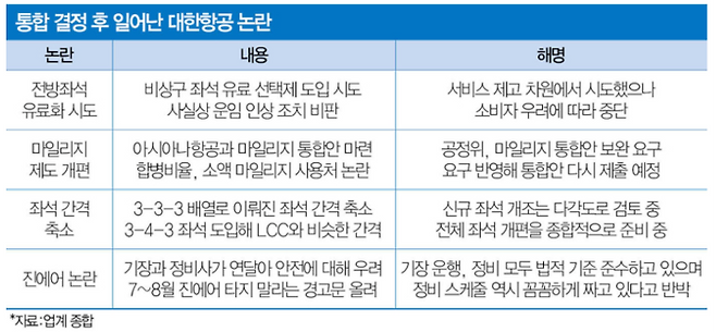 통합 대한항공 출범이 코앞으로 다가왔지만 시작부터 삐걱거리는 모습이다. 마일리지 통합안은 공정위로부터 퇴짜를 맞았고, 중·장거리 노선 비행기는 ‘닭장 배열’ 논란으로 소비자 원성이 쏟아진다. 계열 LCC 진에어 관리 부실 논란도 덮쳤다. 대형 FSC 2개사가 합쳐지는데, 자칫 LCC보다 못한 항공사가 될 것이란 불만이 속출한다.