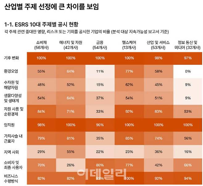 산업별로 공시 주제에는 뚜렷한 차이가 있었지만, 기후변화, 임직원, 비즈니스 수행 관련 항목은 대부분의 기업이 공통적으로 다룬 핵심 주제로 나타났다. 특히 기후변화 관련 공시가 전혀 없었던 기업은 전체 250개 중 단 2곳에 불과했으며, 이들 기업은 해당 주제가 자사 또는 이해관계자에게 중대한 영향을 미치지 않는다는 판단 근거를 보고서에 명확히 제시한 것으로 확인됐다.
