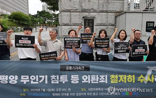 (서울=연합뉴스) 서명곤 기자 = 1일 서울 서초구 서울고검 앞에서 자주통일평화연대, 한반도평화행동 회원들이 윤석열 전 대통령과 김용현 전 국방부 장관에 대한 외환죄 수사를 촉구하고 있다. 이들은 "윤 전 대통령과 김 전 국방부 장관이 비상계엄을 정당화하기 위해 평양 무인기 침투 등 북한과의 무력 충돌을 유도했다는 증거가 드러나고 있다"고 주장했다. 2025.7.1
