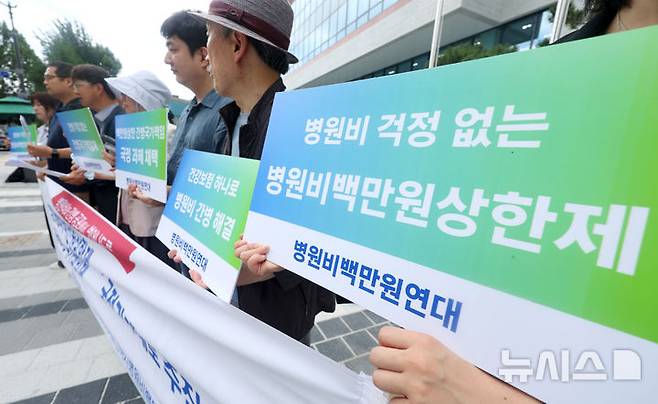 [서울=뉴시스] 홍효식 기자 = 1일 오전 서울 종로구 정부서울청사 창성동 별관 앞에서 어린이부터 어르신까지 병원비백만원연대가 기자회견을 열고 이재명 정부는 간병국가책임제 및 병원비백만원 상한제 시행을 촉구하고 있다. 2025.07.01. yesphoto@newsis.com