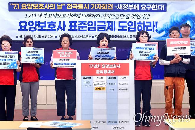 기자회견에선 "17년 경력 요양보호사에게 언제까지 최저임금만 줄 것인가"라는 호소가 나왔다. 임현아 지부장은 "요양보호사들은 최저임금에 갇혀 있다. 경력이 아무리 쌓여도 임금은 오르지 않는다. 전문성도 인정되지 않는다"라며 "때문에 이제 막 신입으로 들어온 요양보호사도, 17년 베테랑 요양보호사도 똑같이 최저임금을 받는다"라고 말했다.