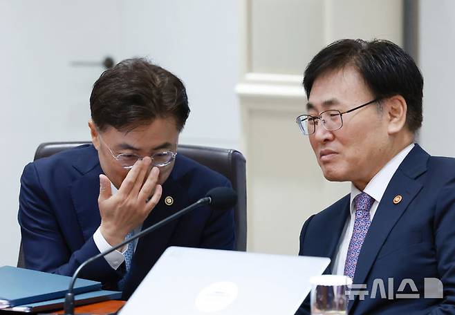 [서울=뉴시스] 고범준 기자 = 유상임(오른쪽) 과학기술정보통신부 장관과 이진수 법무부 차관이 1일 서울 용산 대통령실 청사에서 열린 국무회의에서 대화하고 있다. (대통령실통신사진기자단) 2025.07.01. bjko@newsis.com