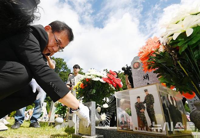 [대전=뉴시스] 강종민 기자 = 이명현 순직해병대원 특별검사를 비롯한 특검팀이 1일 오전 대전 유성구 대전현충원 고 채수근 상병 묘역에서 참배하고 있다. (공동취재) 2025.07.01. photo@newsis.com
