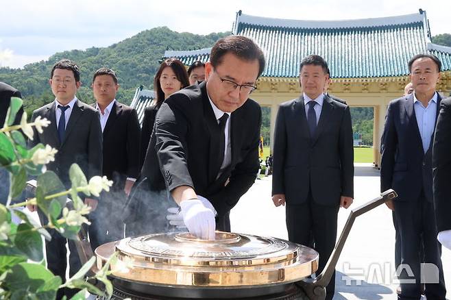 [대전=뉴시스] 강종민 기자 = 순직 해병 수사 외압 사건을 맡은 이명현 특별검사 등 특검 지휘부가 1일 대전 국립현충원에서 현충탑에 분향하고 있다. (공동취재) 2025.07.01. photo@newsis.com
