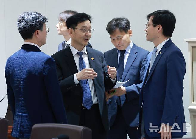 [서울=뉴시스] 고범준 기자 = 김완섭(왼쪽부터) 환경부 장관, 윤창렬 국무조정실장, 여한구 통상교섭본부장이 1일 서울 용산 대통령실 청사에서 열린 국무회의에서 대화를 하고 있다. (대통령실통신사진기자단) 2025.07.01. bjko@newsis.com