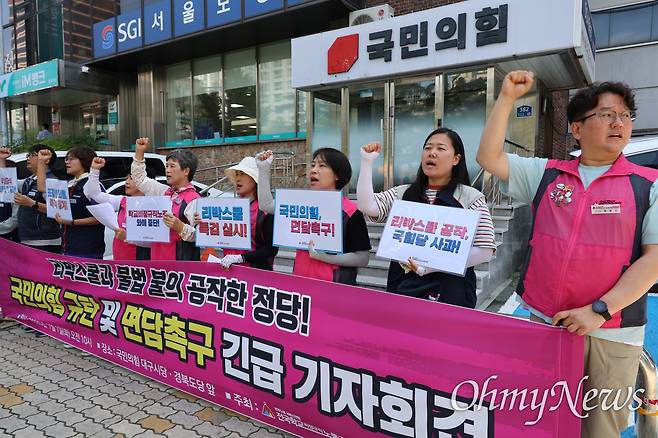 | ▲ 전국학교비정규직노조 대구경북지부는 1일 오전 국민의힘 대구시당 앞에서 기자회견을 열고 리박스쿨과 조정훈 의원이 학교비정규직노조 와해를 위한 공작을 진행했다며 규탄했다. |