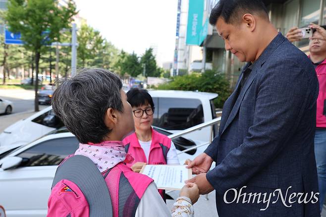 | ▲ 전국학교비정규직노조 대구경북지부는 1일 오전 국민의힘 대구시당 앞에서 기자회견을 열고 학비노조 와해 공작 의혹과 관련 강대식 대구시당위원장과 박형수 경북도당위원장 면담을 요구하는 서류를 국민의힘 관계자에게 전달했다. |