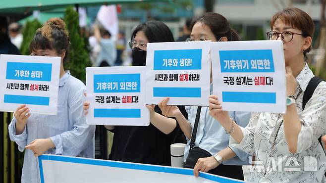 [서울=뉴시스] 홍효식 기자 = 1일 서울 종로구 정부서울청사 창성동 별관 앞에서 한국환경회의 관계자들이 '국정 설계, 시민과 함께! 생명과 환경은 국정의 중심이다' 기자회견을 하고 있다. 2025.07.01. yesphoto@newsis.com