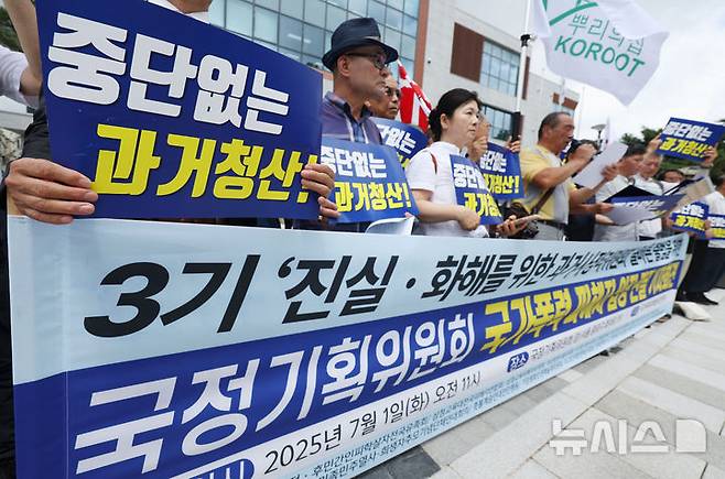 [서울=뉴시스] 홍효식 기자 = 1일 서울 종로구 정부서울청사 창성동 별관 앞에서 국가폭력피해범국민연대가 3기 진실·화해위원회의 올바른 출범을 위한 국정기획위원회 국가폭력 피해자 입장 전달 기자회견을 하고 있다. 2025.07.01. yesphoto@newsis.com
