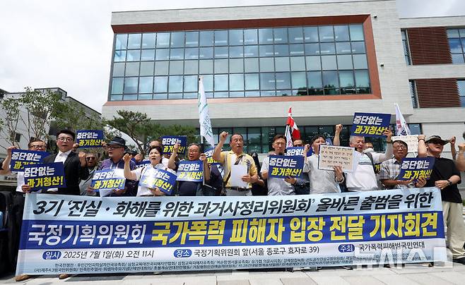 [서울=뉴시스] 홍효식 기자 = 1일 서울 종로구 정부서울청사 창성동 별관 앞에서 국가폭력피해범국민연대가 3기 진실·화해위원회의 올바른 출범을 위한 국정기획위원회 국가폭력 피해자 입장 전달 기자회견을 하고 있다. 2025.07.01. yesphoto@newsis.com