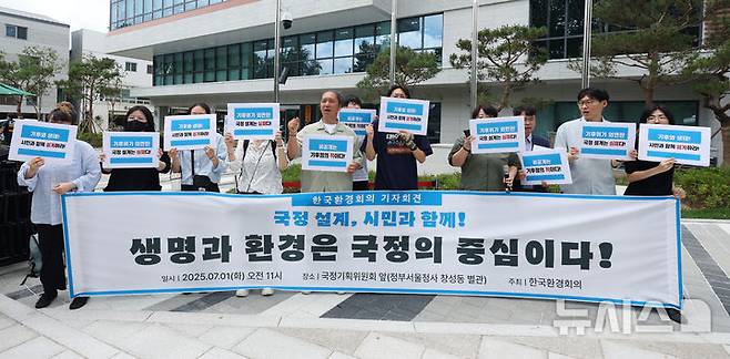[서울=뉴시스] 홍효식 기자 = 1일 서울 종로구 정부서울청사 창성동 별관 앞에서 한국환경회의 관계자들이 '국정 설계, 시민과 함께! 생명과 환경은 국정의 중심이다' 기자회견을 하고 있다. 2025.07.01. yesphoto@newsis.com