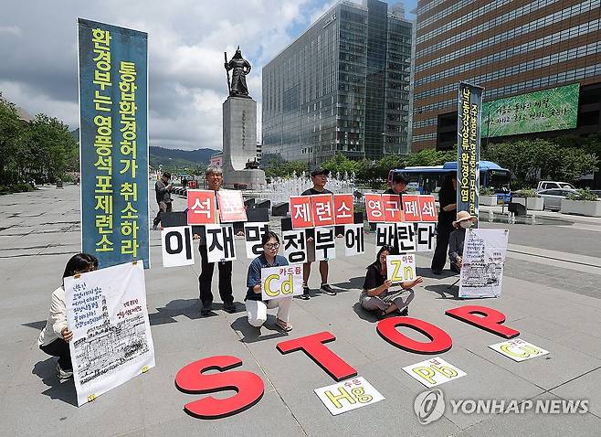 (서울=연합뉴스) 류영석 기자 = 1일 서울 광화문광장에서 열린 환경보건시민센터 영풍석포제련소 폐쇄 촉구 기자회견에서 참가자들이 팻말을 들고 있다. 2025.7.1