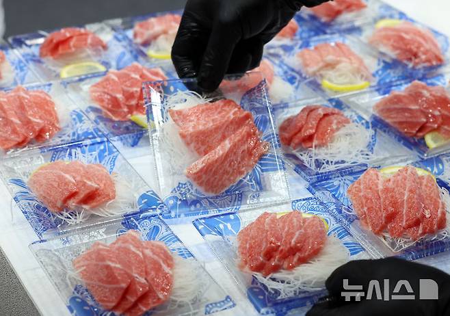 [서울=뉴시스] 이영환 기자 = 1일 오전 서울 강남구 코엑스에서 열린 2025 코리아씨푸드쇼 동원산업 부스에서 시식용 참치가 진열되고 있다. 2025.07.01. 20hwan@newsis.com