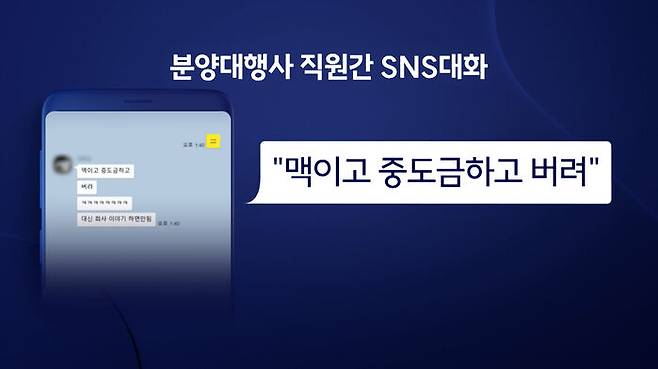 A 씨가 대행사로부터 추천받았던 지식산업센터 역시, 일부는 중도금 대출이 승인되지 않았던 다른 투자자의 물건을 대행사가 A 씨에게 넘겼던 물건이었습니다. 취재 과정에서 확보한 대행사 직원들 간의 SNS 대화에는 "먹이고 중도금하고 버려"라는 표현이 적나라하게 나옵니다. 중도금 대출이 일어나는 것을 확인하고 잠적하라는 취지로 보입니다.