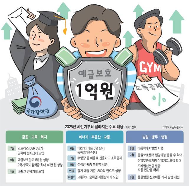 오는 9월부터 은행·저축은행·상호금융 등 금융회사가 파산하더라도 예금자가 맡긴 돈 1억 원까지 보호받을 수 있게 된다. 하반기에 국가장학금이 연 최대 40만 원 인상되며 한부모 가정에 국가가 양육비 20만 원을 먼저 지급하는 보육지원제도도 신설된다. 1일 정부가 발간한 ‘2025년 하반기부터 이렇게 달라집니다’에 따르면 오는 9월 1일부터 예금보험공사가 예금을 보호하는 금융회사와 신협·농협 등 상호금융권 모두 예금보호한도가 5000만 원에서 1억 원으로 높아진다. 일반예금과 별도로 보호한도를 적용 중인 퇴직연금·연금저축·사고보험금의 예보한도도 1억 원으로 상향된다.