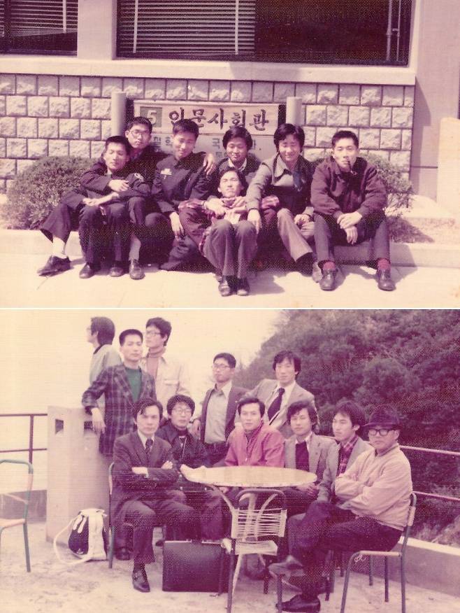 | ▲ 위 사진, 서울대 인문관 앞에서. 왼편 앞에 앉은 이가 이을호 아래 사진, 철학과 MT 때 찍은 사진. 왼쪽 끝 체크무늬 양복 입은 이가 이을호 |