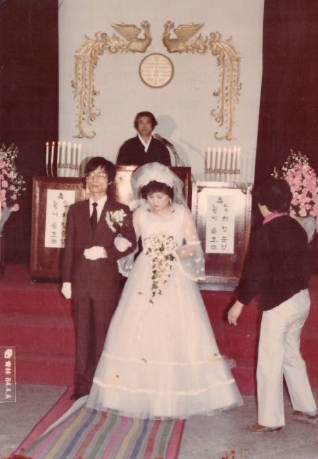 | ▲ 1984년 4월 흥사단에서 있었던 결혼식 사진. 뒤로 주례 백기완 선생이 보인다. |