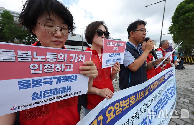 [서울=뉴시스] 조성우 기자 = 김창광(왼쪽 세 번째) 민주노총 서비스연맹 위원장이 1일 오전 서울 용산구 대통령실 앞에서 열린 7.1 요양보호사의 날 전국 동시기자회견에서 연대발언을 하고 있다. 2025.07.01. xconfind@newsis.com