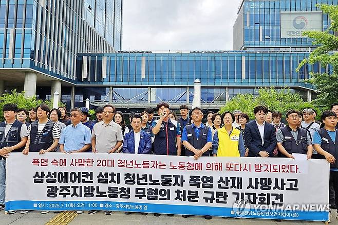 (광주=연합뉴스) 1일 오전 광주지방고용노동청 앞에서 광주전남노동안전보건지킴이가 폭염 속 사망한 에어컨 설치 기사의 사건을 불기소 의견으로 송치한 광주지방고용노동청을 규탄하는 기자회견을 하고 있다. 2025.7.1 [광주전남노동안전보건지킴이 제공. 재판매 및 DB 금지]