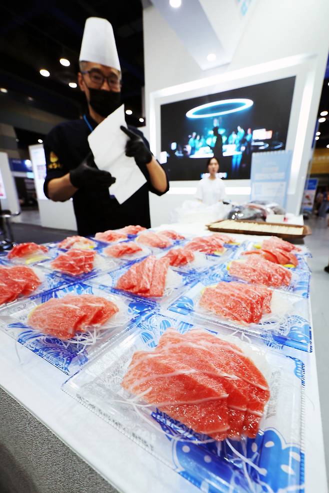 (서울=뉴스1) 황기선 기자 = 1일 서울 강남구 코엑스에서 열린 '2025 코리아씨푸드쇼'에서 동원산업 부스 관계자가 참치 시식을 준비하고 있다. 2025.7.1/뉴스1