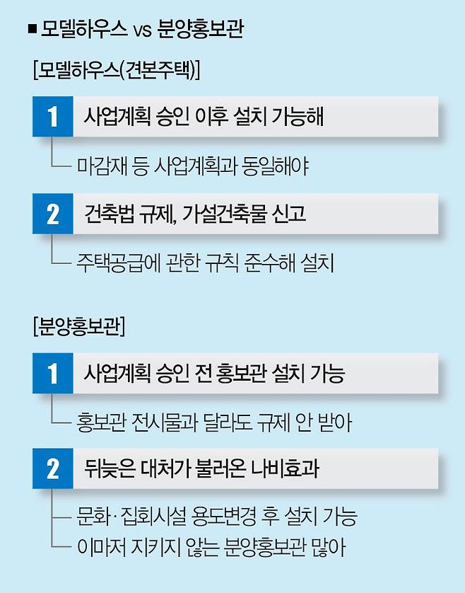 분양홍보관은 다르다. 사업 승인을 받기 전에도 설치할 수 있다. 모델하우스와 달리 건물의 외관이나 내부모형을 자세히 소개하지도 않는다. 분양사기 논란은 주로 여기서 발생한다. 사업 승인 전에 분양홍보관을 설치한 탓에 전시한 대로 건축하지 않아도 위법이 아니다. 수익형 부동산이나 아파트를 계약한 후 투자자들이 "완공된 건물과 홍보관에서 본 건물이 다르다"면서 하소연하는 사례가 많은 건 이 때문이다.