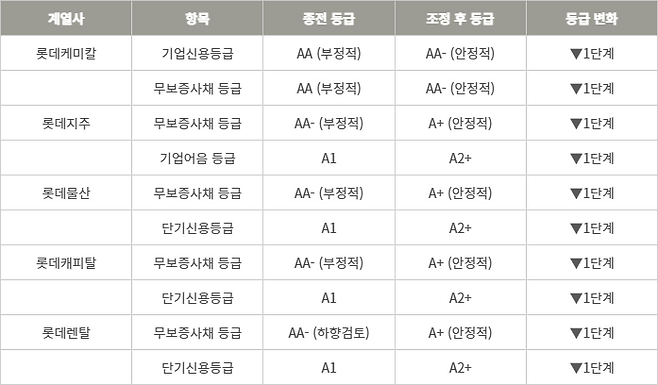 이 여파로 모회사인 롯데지주와 주요 계열사들의 신용등급도 줄줄이 낮아졌다.