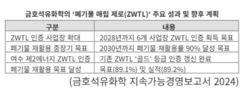 현재 ZWTL 인증을 획득한 사업장은 여수 제2에너지가 유일하다. 금호석유화학은 이를 2028년까지 여수·울산 등 총 6개 사업장으로 확대한다는 계획이다. 일각에서 속도 조절이 필요하다는 지적에 회사 측은 "각 사업장별 로드맵을 이미 수립한 상태"라며 "올해는 여수 제1에너지 사업장의 인증을 목표로 차질 없이 진행 중"이라고 밝혀 확대 기조에는 변함이 없다는 입장을 분명히 했다.