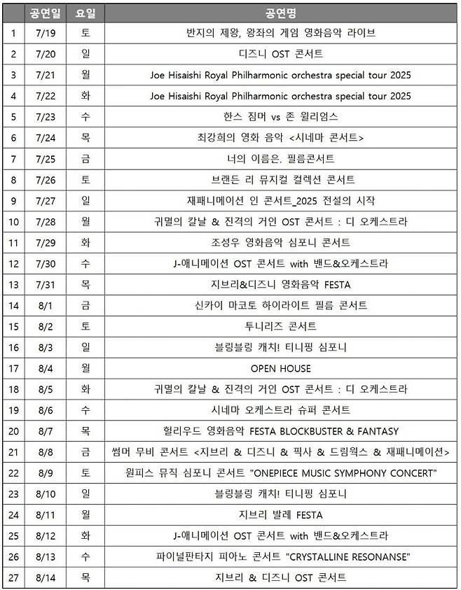 이 외에도 최강희의 영화 음악 '시네마 콘서트(7월24일)', '너의 이름은' 필름 콘서트(7월25), 조성우 영화음악 심포니 콘서트(7월29), 신카이 마코토 하이라이트 필름 콘서트(8월1일), 투니리즈 콘서트(8월2일), 원피스 뮤직 심포니 콘서트(8월9일), 파이널판타지 피아노 콘서트(8월13일) 등 영상과 음악이 함께 어우러진 필름 콘서트가 다채롭게 열린다.