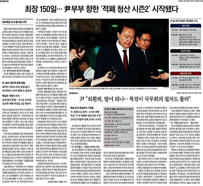 | ▲ <조선일보>는 6월 30일에도, 7월 1일에도 사설에서 윤석열씨의 내란 특검 출석을 언급하지 않았다. 뿐만 아니라 30일 지면 4면에는 윤씨의 내란 특검 조사를 보도하면서 "최장 150일… 尹부부 향한 '적폐 청산 시즌2' 시작됐다"라는 제목을 달았다. |