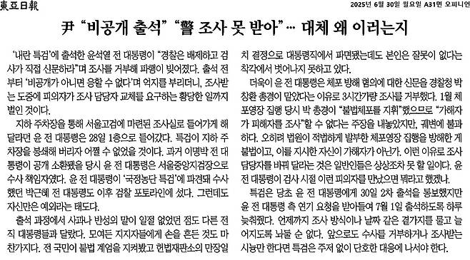 | ▲ 보수 언론인 <동아일보> 역시 "尹(윤) "비공개 출석" "警(경) 조사 못 받아"… 대체 왜 이러는지"라는 제목의 사설에서 "출석 전부터 '비공개가 아니면 응할 수 없다'며 억지를 부리더니, 조사받는 도중에 피의자가 조사 담당자 교체를 요구하는 황당한 일까지 벌인 것"이라고 지적했다. |