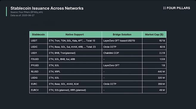 USDG: USDG는 싱가포르 소재의 팍소스(Paxos) 자회사가 발행하며, 현재 이더리움 및 솔라나 네트워크를 네이티브하게 지원한다. 별도의 크로스체인 솔루션은 지원되지 않는다.