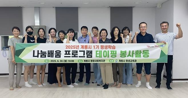계룡시는 지난 30일 배움을 통해 얻은 지식을 지역사회에 환원하는 '나눔배움 프로그램'의 일환으로 평생학습 프로그램 '스포츠 테이핑' 강좌 수료생과 강사가 함께 근육과 관절 통증을 겪고 있는 지역 주민을 대상으로 테이핑 봉사활동을 펼쳤다고 전했다.