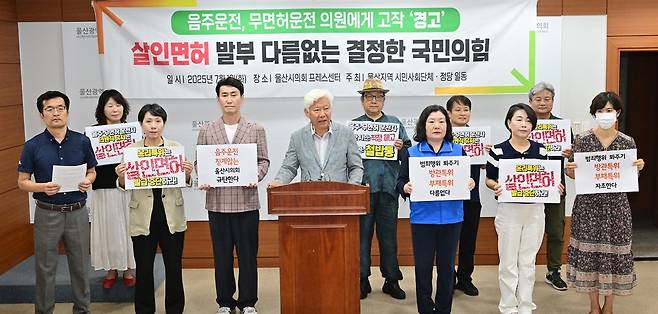 | ▲ 울산시민연대 등 시민사회단체와 정당들이 1일 오후 2시 시의회 프레스센터에서 기자회견을 열고 시의회 윤리특위의 무면허운전 적발 홍성우 시의원에 대한 '경고' 징계를 비판하면서 재논의를 요구하고 있다. |