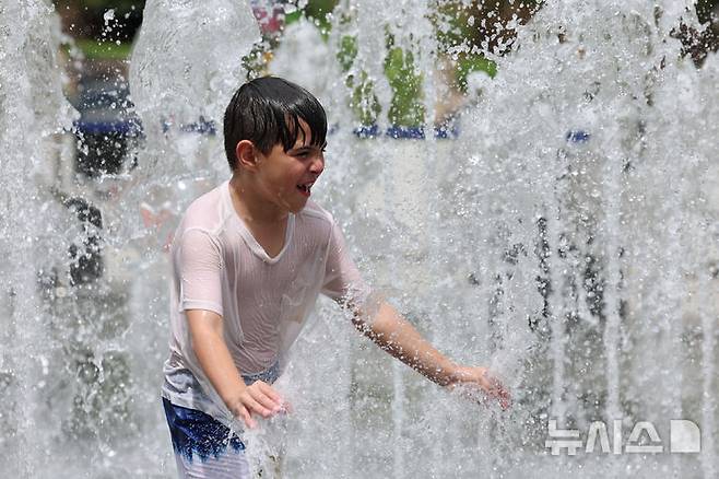 [서울=뉴시스] 권창회 기자 = 서울지역에 이틀째 폭염주의보가 지속중인 1일 서울 종로구 광화문광장 인근에서 외국인 관광객이 물놀이를 하고 있다. 2025.07.01. kch0523@newsis.com