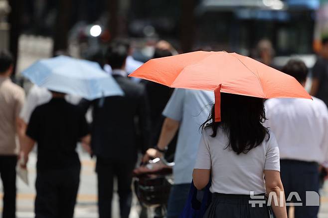 [서울=뉴시스] 권창회 기자 = 서울지역에 이틀째 폭염주의보가 지속중인 1일 서울 종로구 광화문광장 인근에서 시민들이 양산을 쓰고 이동하고 있다. 2025.07.01. kch0523@newsis.com